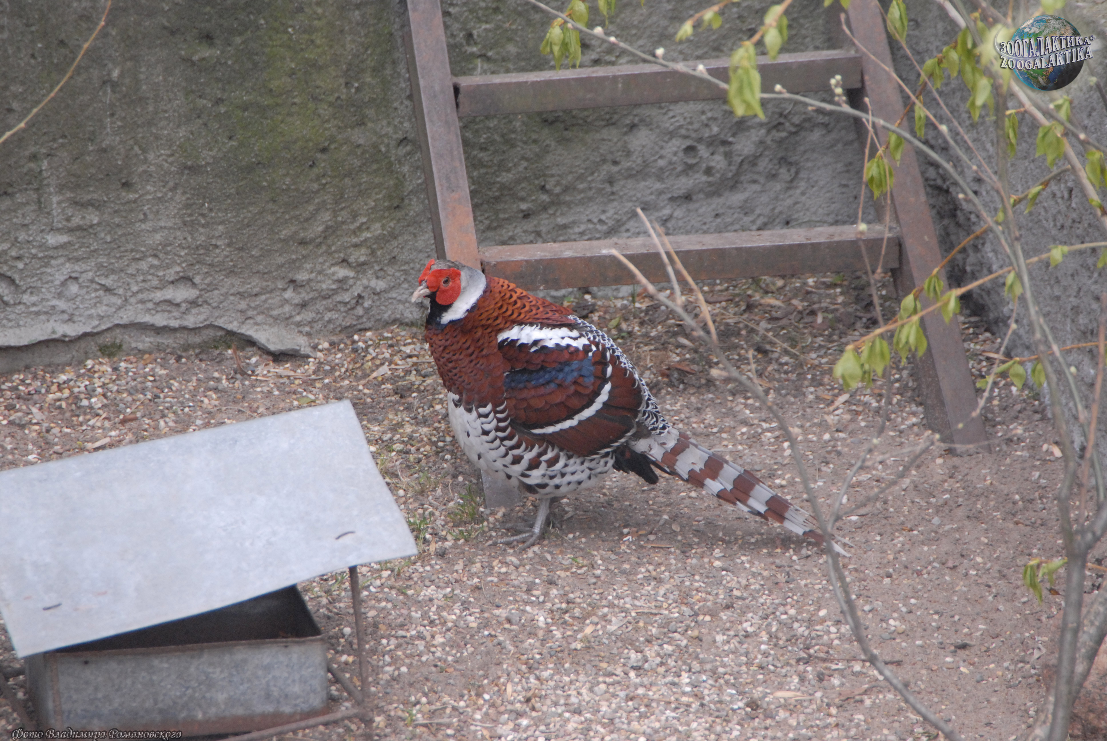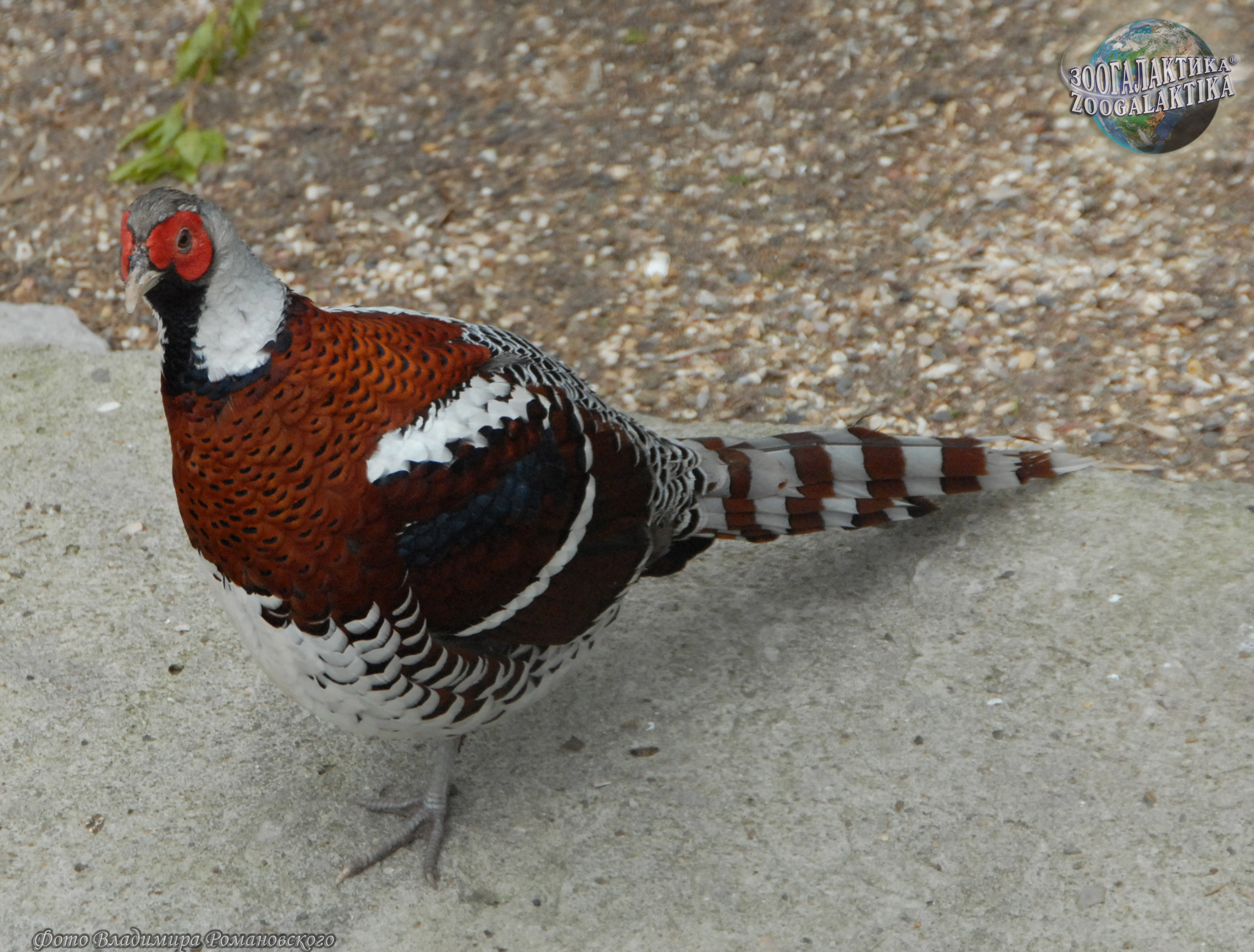 Голова и шея у этого фазана светло-серые, голая часть головы ярко-красная, подбородок, горло и передняя часть шеи черные, зоб, верхняя часть груди, спина и кроющие перья крыла медно-красные с золотистым отливом. На крыльях имеются поперечные темно-синяя и бела полосы. Поясница и надхвостье черные с широкими белыми каемками, низ белый, бока такие же, но с коричневыми пятнами. На хвосте широкие поперечные серые и коричневые полосы. Клюв розового цвета. Ноги синевато-серые, с тонкими длинными шпорами. Длина самца 80, хвост 39 - 40 см, у самки соответственно 50 и 17 - 19 см. Основная окраска самки серо-коричневая, брюхо беловатое, шея серая, на груди и горле по черной полосе.