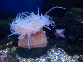 Актинии — крупные одиночные коралловые полипы, их известно около 1500 видов. Свое второе название — морские анемоны — они получили за необычайную красоту и внешнее сходство с цветами. Актинии имеют мягкие трубчатые тела, которые полностью лишены известкового скелета. Тело актиний цилиндрической формы, оно имеет щелевидный рот, окруженный рядами щупалец, а снизу заканчивается "подошвой", при помощи которой животное присасывается к подводным предметам. На концах щупалец у некоторых видов актиний образуются ловчие нити за счет формирования большого числа стрекательных капсул, служащих им для нападения и защиты. Яд стрекательных нитей, попав в жертву, мгновенно парализует ее, и даже у человека, дотронувшегося до морского анемона, появляется на коже ожог, а рука на длительный период опухает. Питаются актинии преимущественно различными мелкими беспозвоночными, иногда их добычей становятся мелкие рыбы, которых они сначала убивают или парализуют «батареями» своих стрекательных клеток, а затем с помощью щупалец подтягивают ко рту. Крупные виды актиний (некоторые из них могут достигать в высоту 1 м) питаются также крабами и двустворчатыми моллюсками. Размножаться морские анемоны могут как бесполым (через деление или фрагментацию тела), так и половым путем. При половом размножении оплодотворение и развитие яиц может происходить в гастральной полости самой актинии или в воде при наружном оплодотворении. Личинка их называется планулой, она не похожа на взрослую актинию и свободно плавает среди планктона. После определенного периода времени (различного у разных видов), планула подвергается метаморфозу, превращаясь в новую особь актинии.